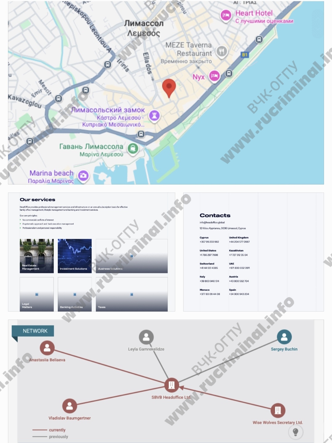 На сайте кипрской SBVB HEADOFFICE LIMITED говорится, что компанией управляет «команда опытных узкоспециализированных экспертов и региональных представителей в ключевых регионах мира». «Мы предоставляем нашим клиентам услуги по управлению частным капиталом, основными активами и управлению проектами, помогая им достигать большего, затрачивая значительно меньше времени и усилий», — обещают в HeadOffice. На сайте даны телефоны для клиентов в разных странах мира: Великобритании, США, Казахстане, Швейцарии, ОАЭ, Италии, Австрии, Монако, Испании и др. Баумгертнер пользуется почтой на этом же домене — в частности, она указана в карточке его российского ИП на агрегаторах.