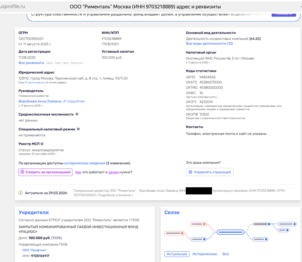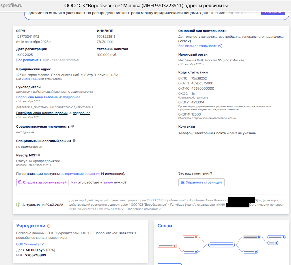 Фирма «СЗ «Воробьевское» была зарегистрирована в сентябре 2025 года фирмой из дивизиона Саркисовых - «Секьюлар Инвестментс Лтд» и неким ООО «Рименталь».
