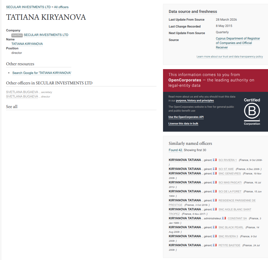 Что интересно: руководителями SECULAR INVESTMENTS LTD являются две дамочки, на которые оформлено штук 100 французских фирм - SVETLANA BUGAEVA и TATIANA KIRYANOVA. А ведь именно в этой юрисдикции по слухам ныне и обитают братья Саркисовы, предпочитая тратить российские деньги в не дружественных РФ странах. Совпадение?