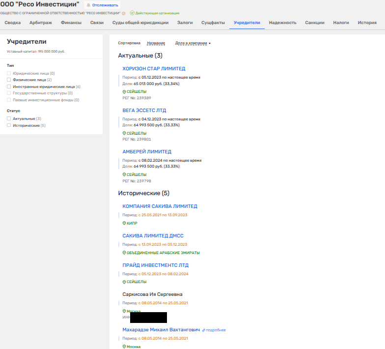 На сегодня владельцами «РЕСО-Инвестиции» совершенно официально числятся три фирмы с Сейшел - «ХОРИЗОН СТАР ЛИМИТЕД», «ВЕГА ЭССЕТС ЛТД» и «АМБЕРЕЙ ЛИМИТЕД», а до них были кипрское «САКИВА ЛИМИТЕД», «САКИВА ЛИМИТЕД ДМСС» из ОАЭ и «ПРАЙД ИНВЕСТМЕНТС ЛТД» с Сейшел.