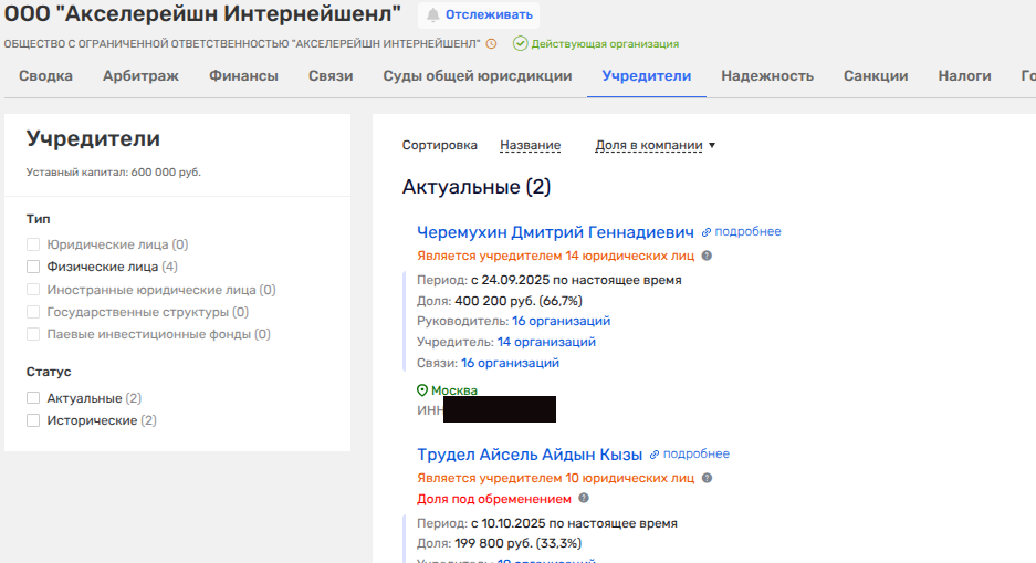 10 октября 2025 года Трудел Айсель Айдын Кызы стала владельцем 33,3% доли в ООО «Акселерейшн интернейшенл». Фирма имеет на балансе 11,7 га земли на Рублевском шоссе, что делает ее весьма привлекательной. Эксперты оценивают долю Трудел от 0,5 млрд рублей.