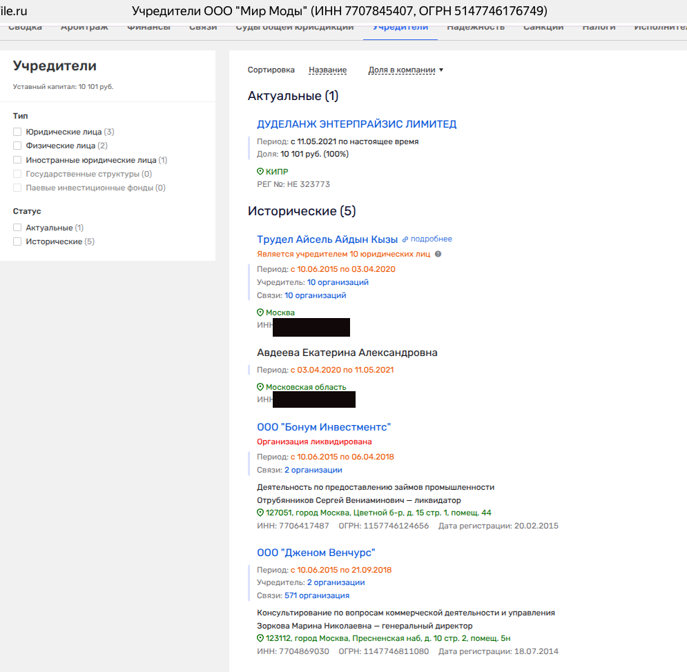 Позднее владельцев ООО «Мир моды» спрятали за кипрским ДУДЕЛАНЖ ЭНТЕРПРАЙЗИС ЛИМИТЕД, а Трудел и фирмы вышеуказанных лиц из капитала как бы вышли.
