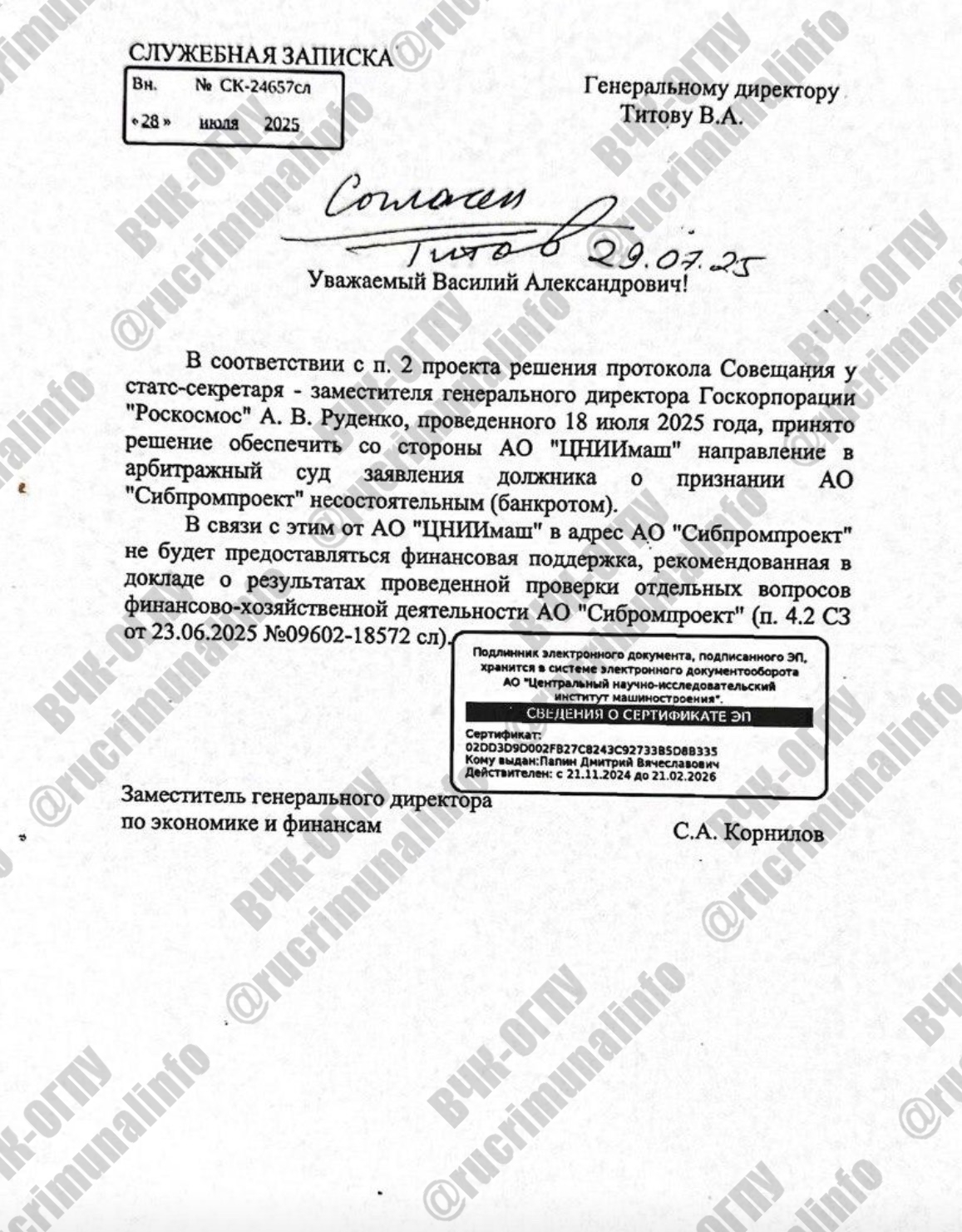 ЦНИИмаш инициировал процедуру банкротства дочерней организации Сибпромпроект. В настоящее время также инициирована ликвидация данной организации. Сибпромпроект является исполнителем контрактов по гособоронзаказу, персонал не получает зарплату пять месяцев. Общая задолженность по зарплате составляет уже свыше 40 млн руб. Персонал увольняется. Сибпромпроект под управлением ЦНИИмаш фактически лишен возможности функционировать. Как выяснилось, банкротство инициировано юридической службой с подачи службы экономической безопасности ЦНИИмаш. По данным телеграм-канала ВЧК-ОГПУ и Rucriminal.info Службу возглавляет бывший сотрудник следственного комитета и департамента экономической безопасности госкорпорации Роскосмос Дмитрий Ермоленко. Нужно отметить, что после смены руководства в ЦНИИмаш это не первое (после Сибпромпроекта) необоснованное решение, инициированное начальником службы экономической безопасности. ЦНИИмаш выступил с инициативой расторжения договора аренды помещения с ООО "Неоэнерго". Начальник службы экономической безопасности имеет заместителя Наталью Пальчикову, с которой близок на протяжении нескольких лет. Его заместитель не имеет высшего образования, однако благодаря личной связи занимает руководящую должность, участвует в принятии решений, в том числе по указанным выше организациям. Кроме того, заместитель по совместительству работает и получает зарплату в Технопарке, дочерней организации ЦНИИмаш, также испытывающей экономические проблемы и не ведущей хозяйственной деятельности. Обращает внимание факт, что указанные начальники службы экономической безопасности используют свои возможности для улучшения качества своей жизни, а не предприятия. В недавно приобретенном жилье ремонт сделан силами подрядчика, который выполнял строительные работы для ЦНИИмаш. Куда заведет такая служба экономической безопасности головное предприятие отрасли ЦНИИмаш, его генерального директора Василия Титова, Сибпромпроект и другие зависящие предприятия?