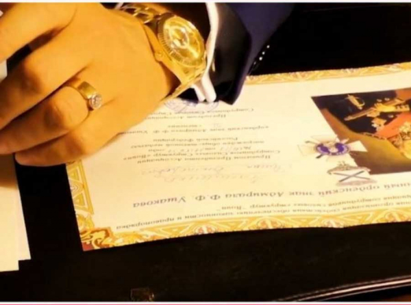 Его комбинатор приобрёл благодаря некому «Всероссийскому комитету по общественным наградам и званиям». Восьмиконечная звезда с шапкой Мономаха. За дополнительную плату — именной кортик, настенная плакетка, именные часы.