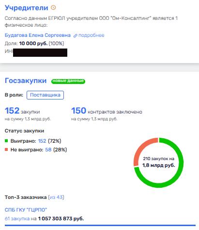 В октябре-ноябре 2025 года Санкт-Петербургское государственное казённое учреждение «Городской центр рекламы и праздничного оформления» (ГЦРПО), подконтрольное комитету имущественных отношений, активно раздавало госконтракты на украшение города елками и световыми конструкциями. Распилены были сотни миллионов рублей и, судя по топ-у исполнителей, ежегодно победители одни и те же, и в числе них некое ООО «Ом-Консалтинг», наколотившее на заказах центра более 1 миллиарда рублей.