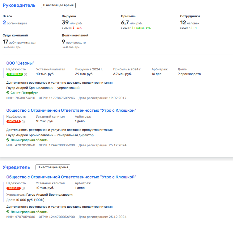 Юридическим владельцем ООО «Ом-Консалтинг» выступает Елена Будагова, имеющая в активе ресторанное ООО «Сезоны», чьим управляющим является некий Андрей Гауэр. Тот же в свою очередь владеет другой ресторанной фирмой - ООО «Утро с Клюшкой», прописанное в д.Клюшкино Ломоносовского района Ленобласти. Там же прописано и ООО «Земляничные поляны» - элитный гольф-клуб с ресторанами и собственным коттеджным поселком. Генеральным спонсором сезона в гольф-клубе, судя по сайту, выступает Газпромбанк.