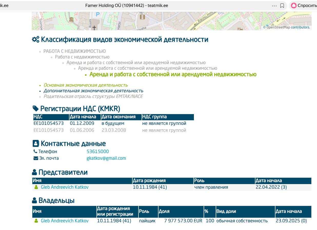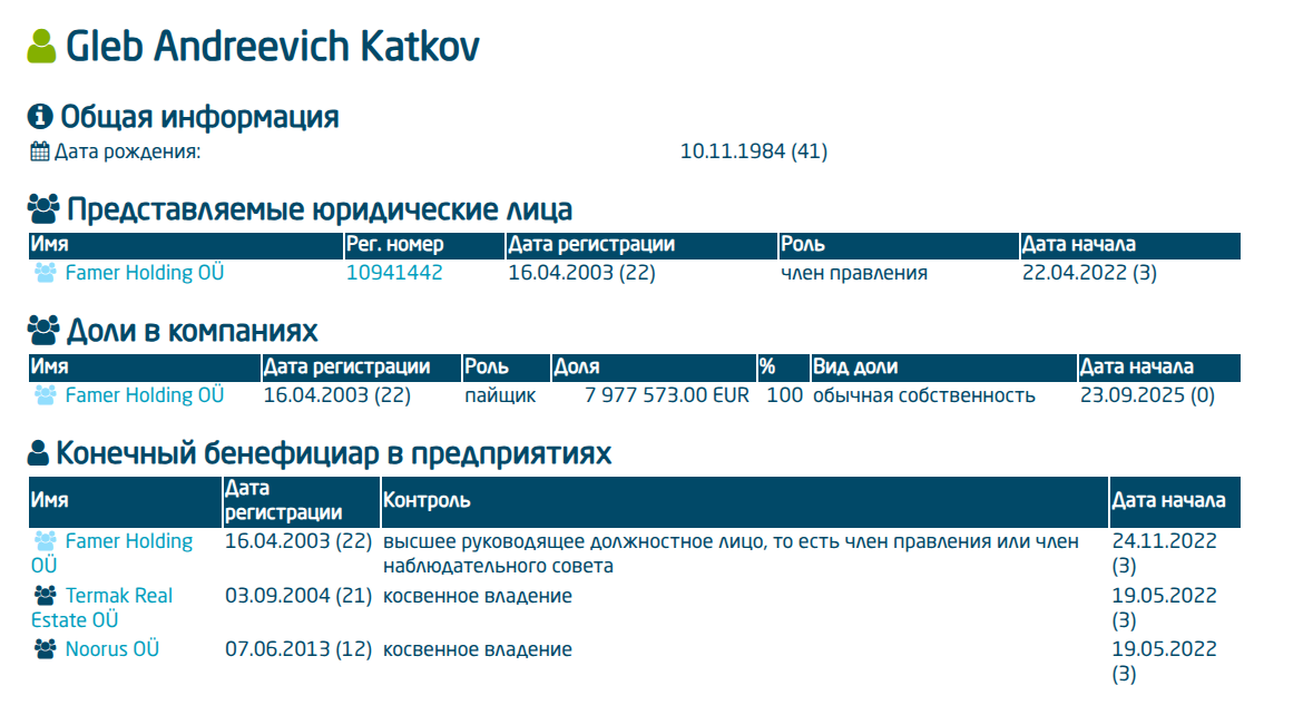Gleb Andreevich Katkov так и остался владельцем сразу трех компаний в Эстонии - Famer Holding OÜ, Termak Real Estate OÜ и Noorus OÜ. Именно Глеб Катков с 23.09.2025 года является пайщиком Famer Holding OÜ. Его доля оценивается 7 977 573 евро.