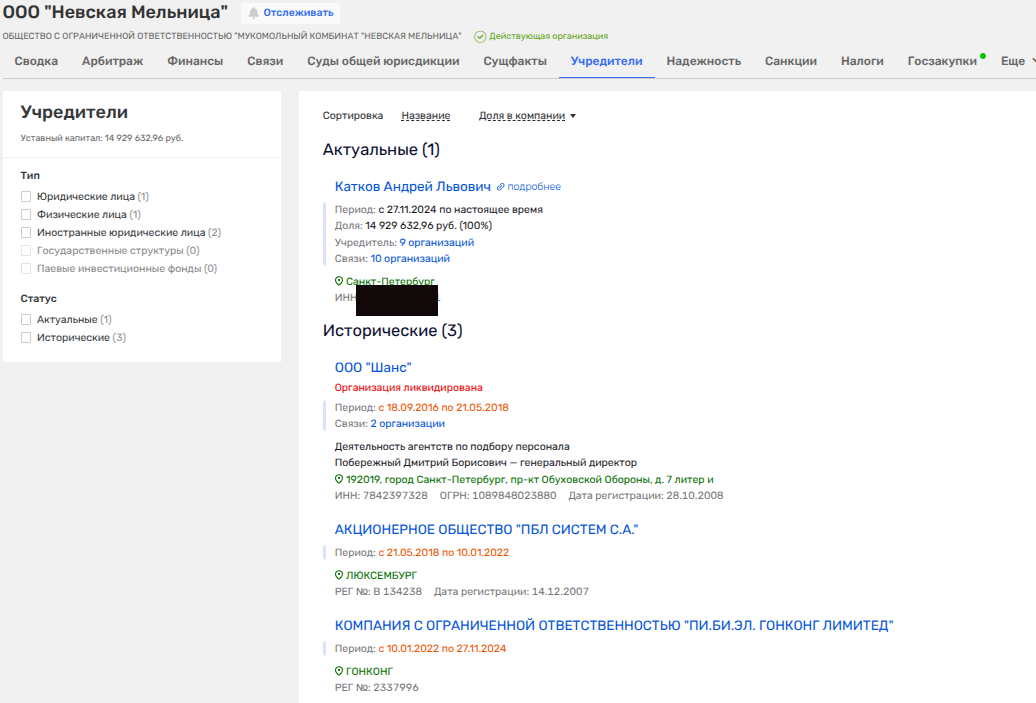 Как мы сообщали выше, вместе с Катковым-старший владельцем ООО «Земляничные поляны» является гонконгская ПИ.БИ.ЭЛ. ГОНКОНГ ЛИМИТЕД, которая также до 27 ноября 2024 года была в числе владельцев ООО «Невская мельница», где наследило и ПБЛ СИСТЕМ С.А. из Люксембурга.