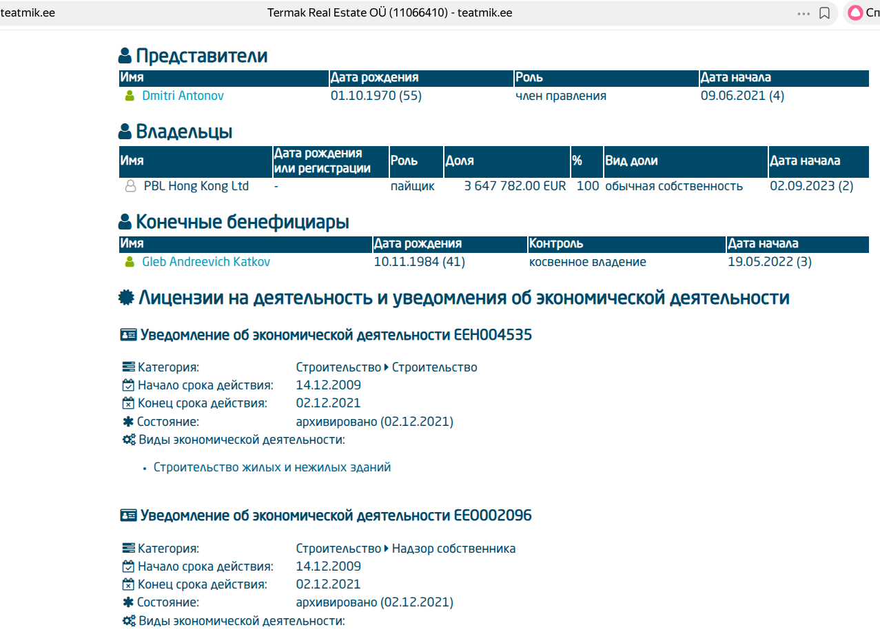 Судя по эстонскому регистру, владельцем эстонской фирмы, связанной с недвижимостью Termak Real Estate OÜ, и является PBL Hong Kong Ltd, а конечным бенефициаром Глеб Катков. Как вам такой расклад?