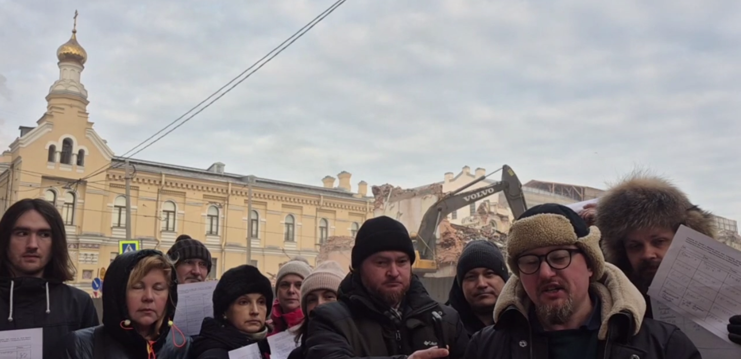 Авторы обращения просят обязать вконец обнаглевшего девелопера восстановить Дом Лапина, снос которого происходит на заднем плане видеообращения.