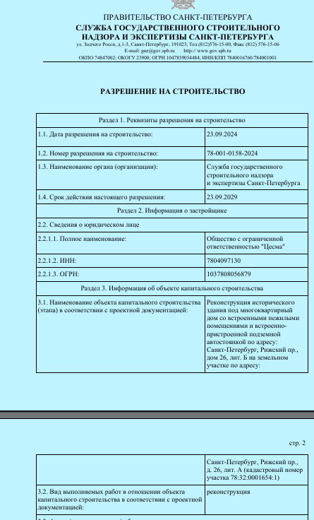 Разрешение на реконструкцию исторического здания под многоквартирный дом со встроенными нежилыми помещениями и встроенно-пристроенной подземной автостоянкой еще в сентябре 2024 года получило ООО «Цесма». Фирма входит в дивизион Setl Group и в феврале 2025 года её переименовали в ООО «СЗ Рижский 26».