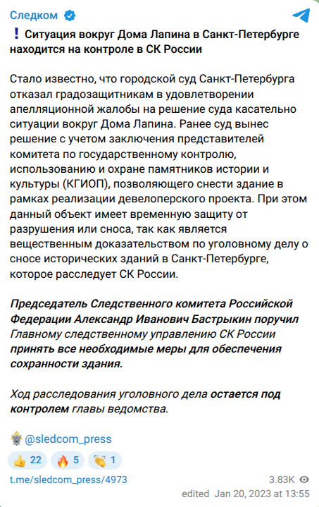 В том же, 2022 году, по просьбе депутатов и градозащитников Следком возбудил уголовное дело, в рамках которого расследовался снос исторических зданий и планы на таковое. В список объектов попал и Дом Лапина, который в 2023 году стал вещдоком. Дело было на контроле лично главы Следкома Александра Бастрыкина и оно было возбуждено в отношении неустановленных должностных лиц КГИОП, которые смошенничали с датами постройки исторических объектов. Последнее в свою очередь привело к сносу ряда зданий и поставило под угрозу остальные. Так, оспаривалась реальная дата постройки Дома Лапина - 1840 год и недоспециалисты комитета утверждали, что это всего лишь очередное здание советского периода.