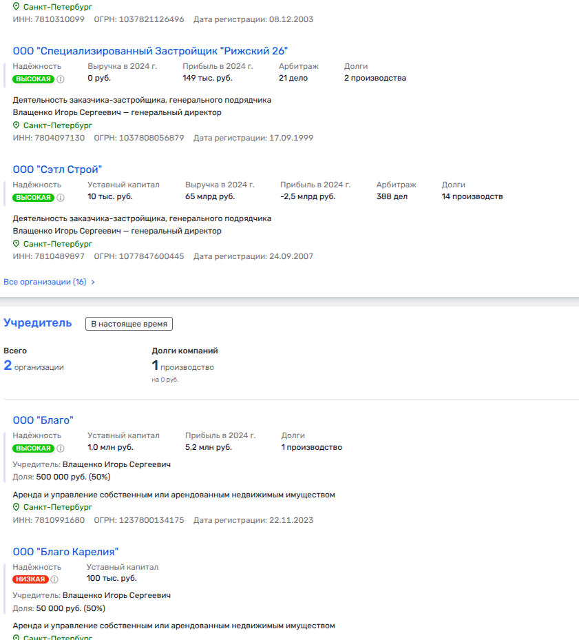 Официально сообщалось, что в Вырице загородный гостиничный комплекс на 5 звезд с рестораном и банным комплексом построит некое ООО «Благо». И каково же было удивление общественности, когда владельцами фирмы с таким названием оказались Екатерина и Игорь Влащенко. Последний не только директор целой группы компаний из дивизиона Setl Group, но и директор того самого ООО «СЗ Рижский 26», сносящего Дом Лапина.