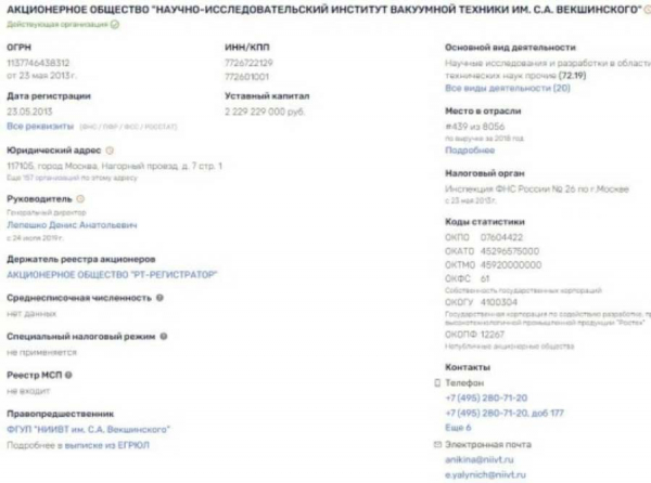 Итак, "РТ-капитал", который занимается реализацией непрофильных активов госкорпорации "Ростех", выставил на продажу 100% акций АО "Научно-исследовательский институт вакуумной техники им. Сергея Векшинского".