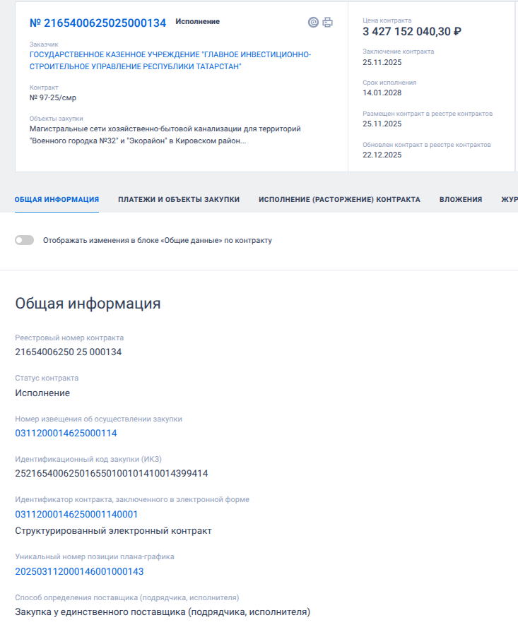 Еще 25 ноября 2025 года Главное инвестиционно-строительное управление РТ (18 декабря к нему подписали досопглашение) подмахнуло контракт на строительство магистральных сетей хозяйственно-бытовой канализации для территорий Военного городка №32 и Экорайон в Кировском районе Казани не просто единственному участнику, а по схеме - закупка у единственного поставщика. То есть подрядчика выбрали заранее.