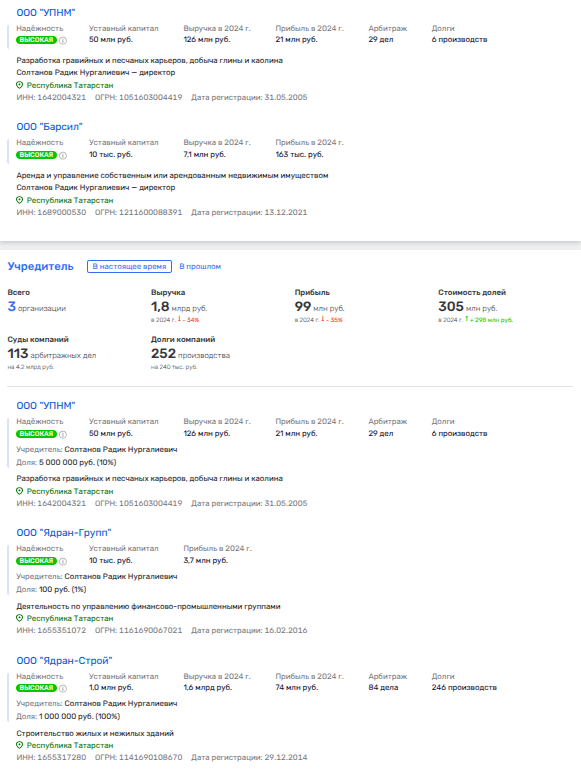 Итак, с сентября 2024 года владельцем фирмы является Радик Солтанов - бывший депутат Совета Абсалямовского сельского поселения Ютазинского муниципального района Республики Татарстан от Единой России. При этом свой мандат он, скорее всего, передал своему же подчиненному - некоему Марату Хасаншину, который работает машинистом в ООО «УПНМ» (разработка гравийных карьеров). В последнем Солтанов является директором с 2012 года, а совладельцем - с 2021 года.
