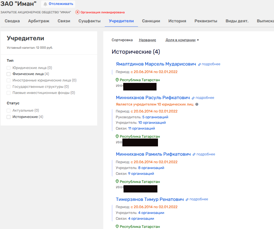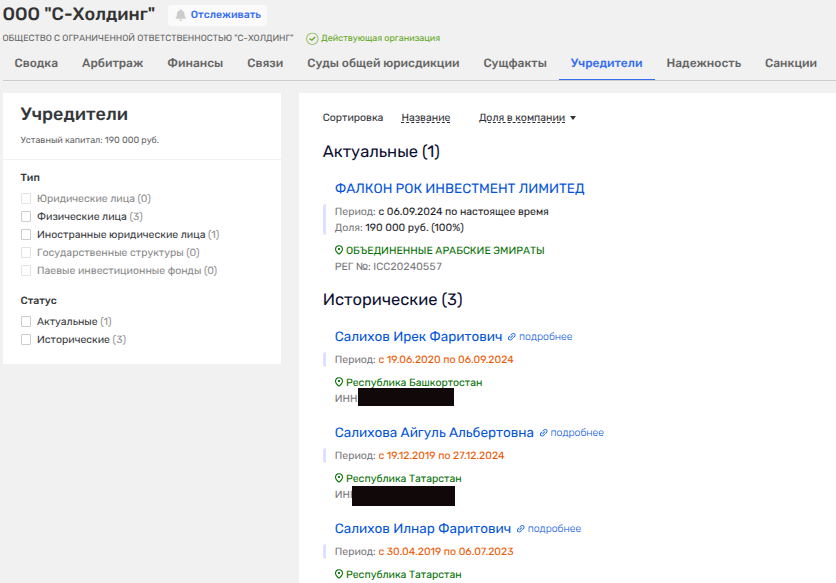 А перед тем, как фирма отошла Солтанову ею владело ООО «Ядран-Групп», в конце цепочки владения которым в период с 2020 по ноябрь 2025 года (через ООО «С-Холдинг») стояли члены семьи Салиховых - Илнар, Ирек и Айгуль. С сентября 2024 года в ООО «С-Холдинг» владельцем стала кубышка из ОАЭ - некое Фалкон Рок Инвестмент Лимитед, скрывающее своих бенефициаров.