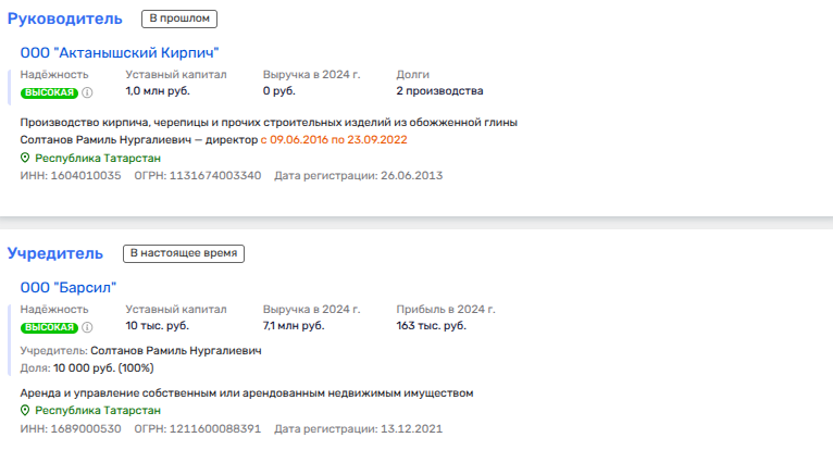 Для прикрытия ушей Салиховых компанию «Ядран-Групп» слили в марте 2025 года все тому же Радику Солтанову - человеку-ширме. На этот статус намекают сразу несколько фактов: во-первых, Солтанов был наемным директором при Салиховых в фирмах, которые потом якобы выкупил, а, во-вторых, некий Рамиль Солтанов, с коим они владели фирмой «Барсил», в 2016-2022 годы был директором ООО «Актанышский Кирпич», которым владел Фарит Салихов - отец братьев.