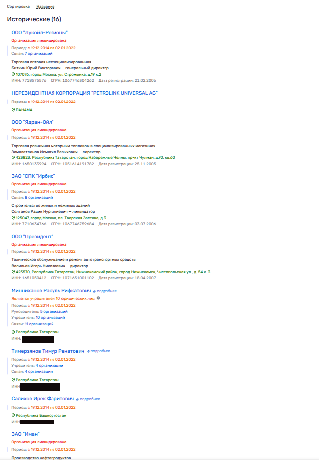 В том же АО «Трейд-Ойл» наследила компания Лукойл, а также приближенный к Миннихановым Фанис Газетдинов (экс-замглавы администрации Актанышского района по экономике и директор ОАО «Набережночелнинский элеватор»), человек Салиховых по УПНМ Файсун Саетов (сейчас директор дочки УПНМ), ряд юрлиц из числа прикрытий реальных бенефициаров, известный автогонщик Тимур Тимерзянов - сын генерал-майора милиции, который был главным федеральным инспектором по Республике Татарстан и работал в структурах МВД Татарстана и Алтайского края. Мать Тимерзянова - Мадина Тимерзянов - директор Национальной библиотеки Татарстана, до этого работавшая на руководящих постах в телерадиокомпаниях РТ.