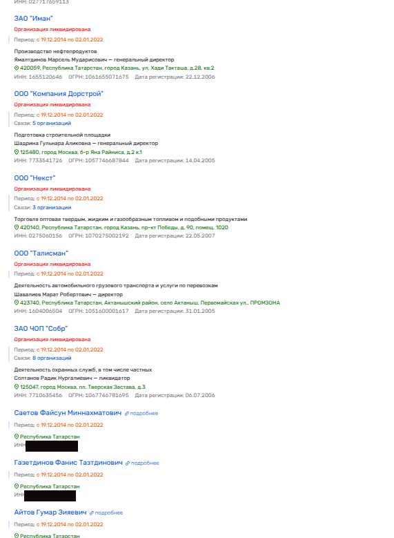 Нефтетрейдер АО «Трейд-Ойл» на сегодня ликвидирован, но именно там среди соучредителей мы видим и марионетку Салиховых - Радика Солтанова, который был руководителем ЗАО ЧОП «Собр» (ликвидировано в декабре 2020 года).