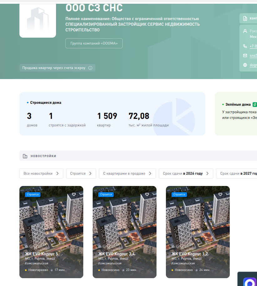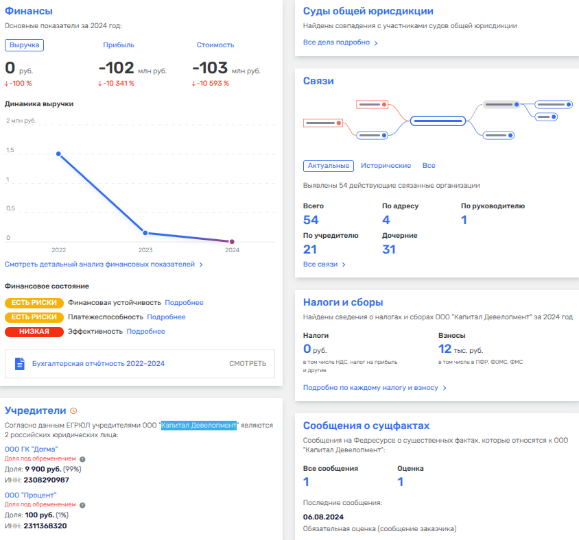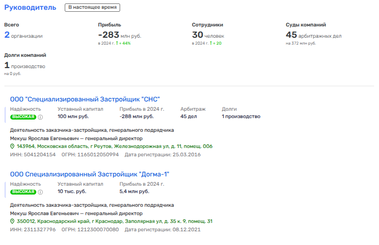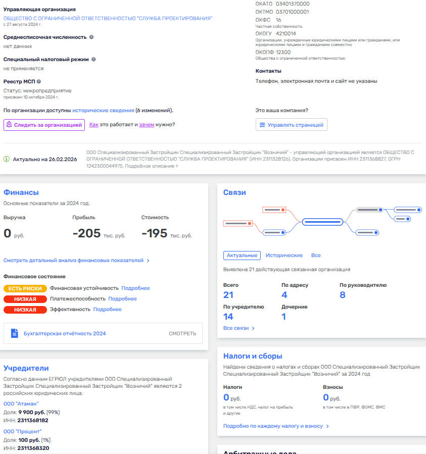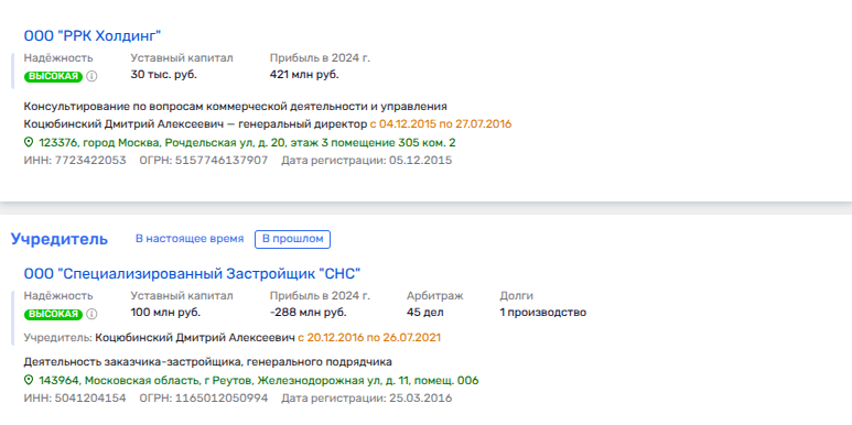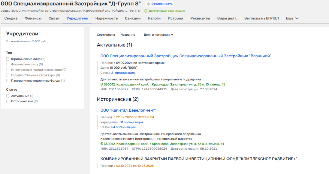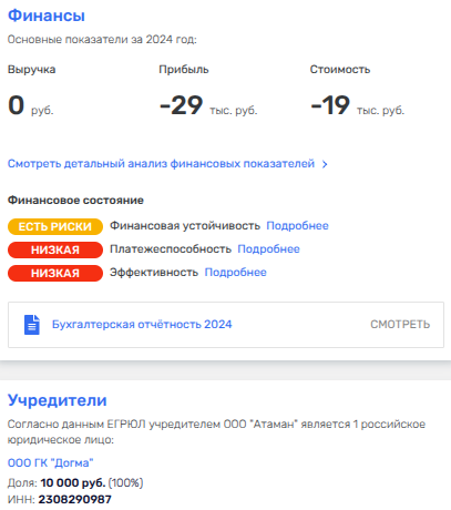 С момента основания фирма принадлежала дивизиону Догмы: сначала ООО «Капитал Девелопмент», чей убыток в 2024 году был весьма впечатляющ - 102 млн рублей, а с осени 2024 года - ООО СЗ «Возничий». Последний был учрежден в августе 2024 года и демонстрировал убыток на 205 тыс. рублей.