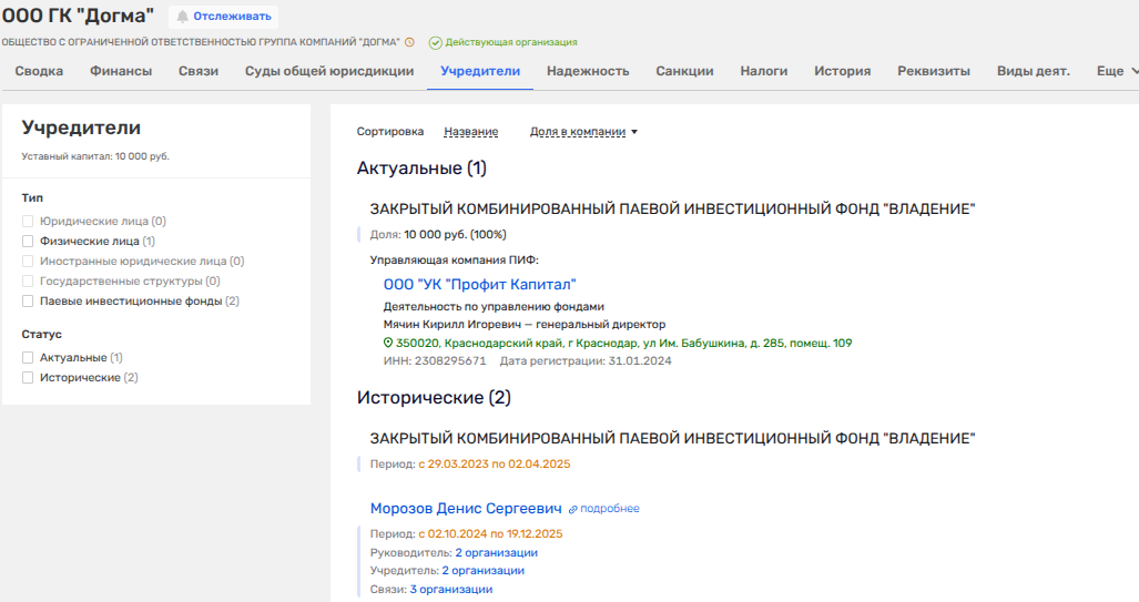 ООО СЗ «Возничий», в частности, принадлежит двум фирмам, созданным в августе 2024 года, - ООО «Атаман» с 99% (убыток - 29 тыс. рублей) и ООО «Процент» (убыток - 218 тыс. рублей). Первая принадлежит ООО ГК «Догма», убыточной в 2024 году на 264 тыс. рублей, а вторая прикрыта ЗПИФ под управлением УК «Профит Капитал», под крыло которого Денис Морозов 19 декабря 2025 года припрятал и ООО ГК «Догма», оставшись при этом там президентом.