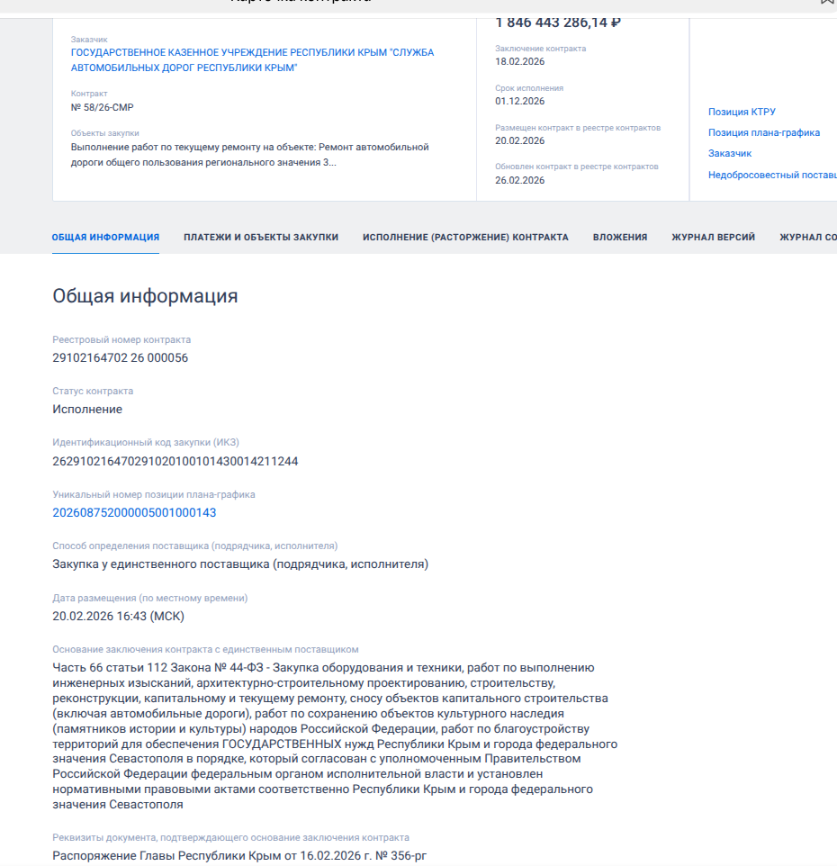 Еще в феврале 2026 года госучреждение «Служба автодорог Крыма» без конкуренции, по схеме закупка у единственного подрядчика, подмахнуло госконтракт на 1,84 млрд рублей. Так на основании распоряжения главы Крыма Аксенова от 16.02.2026 г. № 356-рг контракт на ремонт части дорог Крыма был отдан своим - компании «Дор-Альянс»