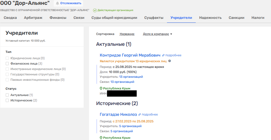 Принадлежит ООО с 25 августа 2025 года Георгию Мерабовичу Контридзе - сыну крымского бизнесмена Мераба Контридзе, с которым у него общие активы.