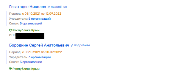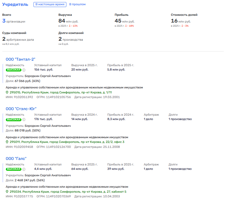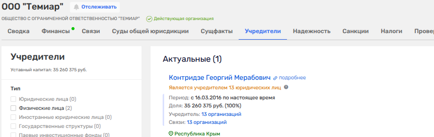 До Контридзе фирма принадлежала Николаю Гогатадзе (они сливают друг другу уже не первый актив), который как минимум по одной фирме - ООО СЗ «Южный Бриз» был партнером депутата Госсовета Крыма Сергея Бородкина, с коим имеет общий бизнес в сфере управления недвижимостью жена главы Крыма Елена Аксёнова - фирмы «Стэлс-Юг» и «Галс» (владеет крупнейшим симферопольским ТЦ «Океан»).