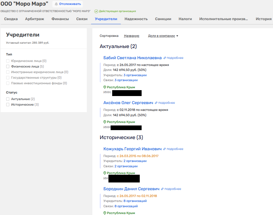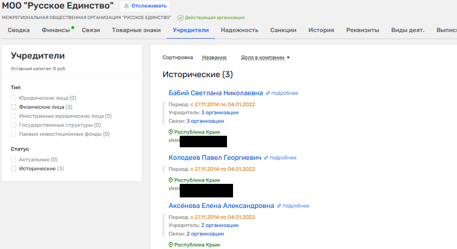 Тот факт, что это никакая не тезка жены Аксенова нам говорит то, что именно она была соучредителем МОО Русское единство. Кстати, вместе с женой Бородкина - Светланой Бабий, которая в свою очередь имеет общий актив с Олегом Сергеевичем Аксеновым - полным тезкой сына главы Крыма. Эти двое сообща владеют «Моро Марэ», где ранее наследил сынок депутата Данил Сергеевич Бородкин. Это намекает нам на тесные связи этих двух семейств, ибо еще не раз то Бородкин, то Бабий мелькали рядом с Аксеновой.