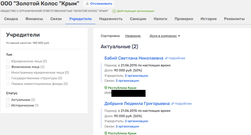 Кстати, рядом с мадам Бабий отирается и Людмила Добрыня - бывший член Общественной палаты Крыма - их связывают фирмы «Бриг Компани» и «Золотой колос «Крым». А Добрыня, судя по открытым данным, никто иная как любимая теща главы Крыма Аксенова.