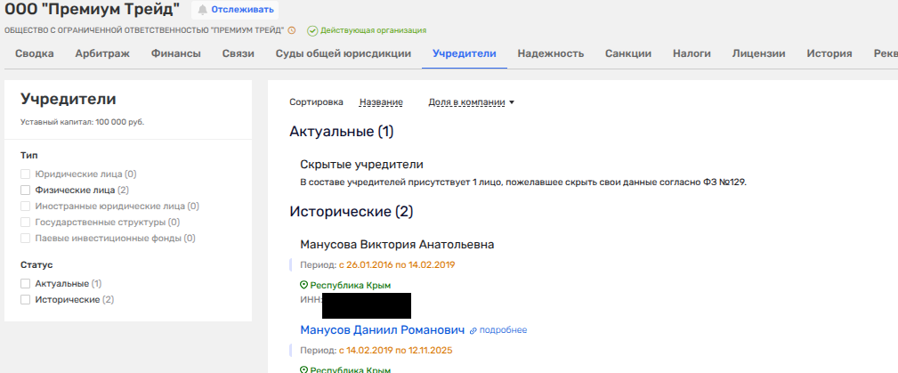 Муженек Манусовой Даниил был владельцем ООО «Премиум Трейд», получившем от Минимущества Крыма в аренду 1,6 тыс. кв.м помещений в пгт. Аграрноена на улице Спортивной, 10 позднее приватизированные. Кстати, с ноября 2025 года в фирме скрывают владельцев. Видимо, чтобы не светить родственной связью?