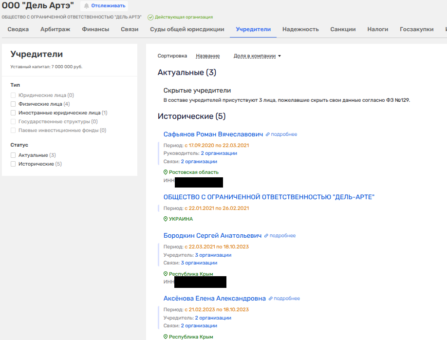 Но давайте обратим внимание еще на одну фирму, где с некоторых пор стали скрывать владельцев, но последними были Елена Аксенова и Сергей Бородкин - ООО «Дель Артэ» из сферы недвижимости, которое возглавляет некая Евгения Перекотий.