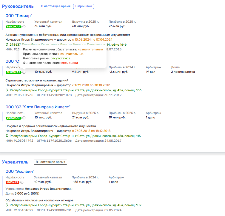 В целом ООО «Дор-Альянс» наколотило на госконтрактах 12,4 млрд рублей, и при этом госзаказчик спустя рукава смотрит на наличие налогового долга у фирмы: на ноябрь 2025 года - 6,68 млн рублей. Единственным заказчиком компании, созданной в феврале 2023 года, и является Служба автодорог Крыма.