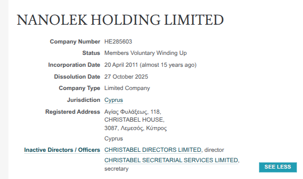 Чтобы юридически прикрыть следы этого бизнеса до семьи Голиковой-Христенко, с 2023 года в фирме начали последовательно менять владельцев. При этом NANOLEK HOLDING LIMITED ликвидировали лишь в конце октября 2025 года, а все это время он продолжал играть свою роль. Помогая выводить бюджетные капиталы?