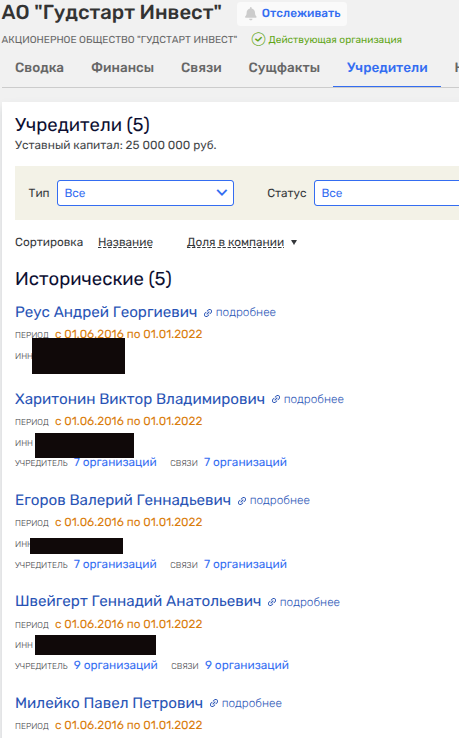 ЗПИФ из числа владельцев «Нанолека» наполовину вывели в начале 2025 года, заменив на доверенных лиц олигарха Христенко - Павла Милейко и Геннадия Швейгарта, которые не только являются вместе с Харитониным бенефициарами Аресбанка, но и связаны через другие юрлица. В частности, связка была по АО «Гудстарт Инвест» и АО «Эс Джи Биотех» (СП харитонинского «Генериума» и ирландской Shire, где можно увидеть еще две кипрские кубышки «Эс Джи Биотех Лимитед» и «Мастершер Энтерпрайзис Лимитед»). Кстати, в АО «Гудстарт Инвест» также присутствовал и уже знакомый нам Реус - доверенное лицо Христенко-старшего.