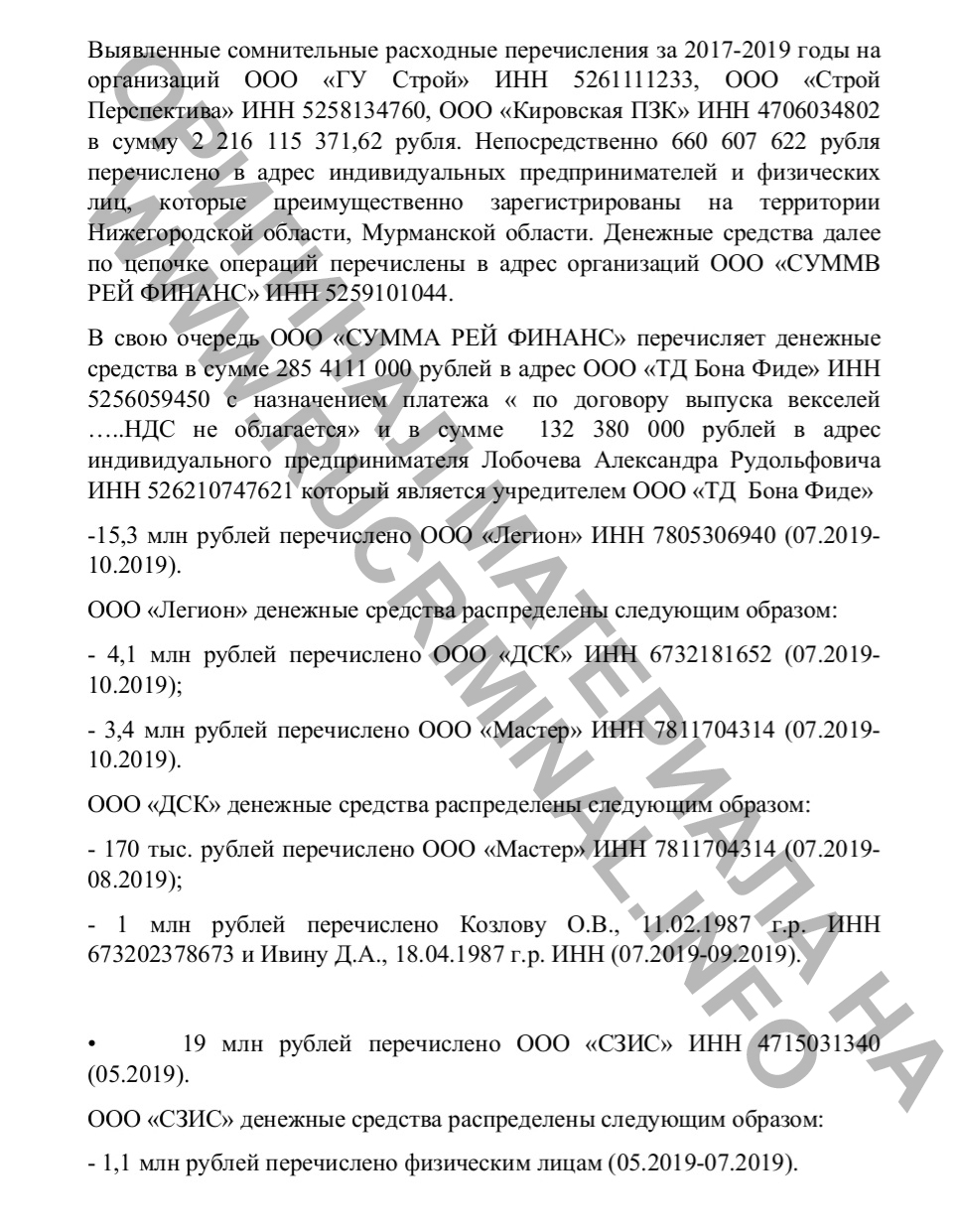 Выявленные сомнительные расходные перечисления за 2017-2019 годы на организаций ООО «ГУ Строй» ИНН 5261111233, ООО «Строй Перспектива» ИНН 5258134760, ООО «Кировская ПЗК» ИНН 4706034802 в сумму 2 216 115 371,62 рубля. Непосредственно 660 607 622 рубля перечислено в адрес индивидуальных предпринимателей и физических лиц, которые преимущественно зарегистрированы на территории Нижегородской области, Мурманской области. Денежные средства далее по цепочке операций перечислены в адрес организаций ООО «СУММВ РЕЙ ФИНАНС» ИНН 5259101044.