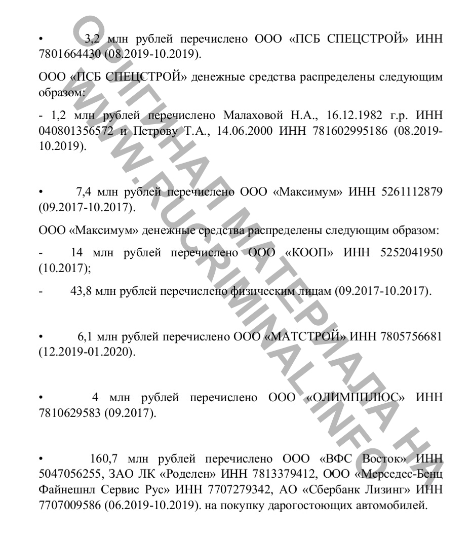 · 160,7 млн рублей перечислено ООО «ВФС Восток» ИНН 5047056255, ЗАО ЛК «Роделен» ИНН 7813379412, ООО «Мерседес-Бенц Файнешнл Сервис Рус» ИНН 7707279342, АО «Сбербанк Лизинг» ИНН 7707009586 (06.2019-10.2019). на покупку дарогостоющих автомобилей.