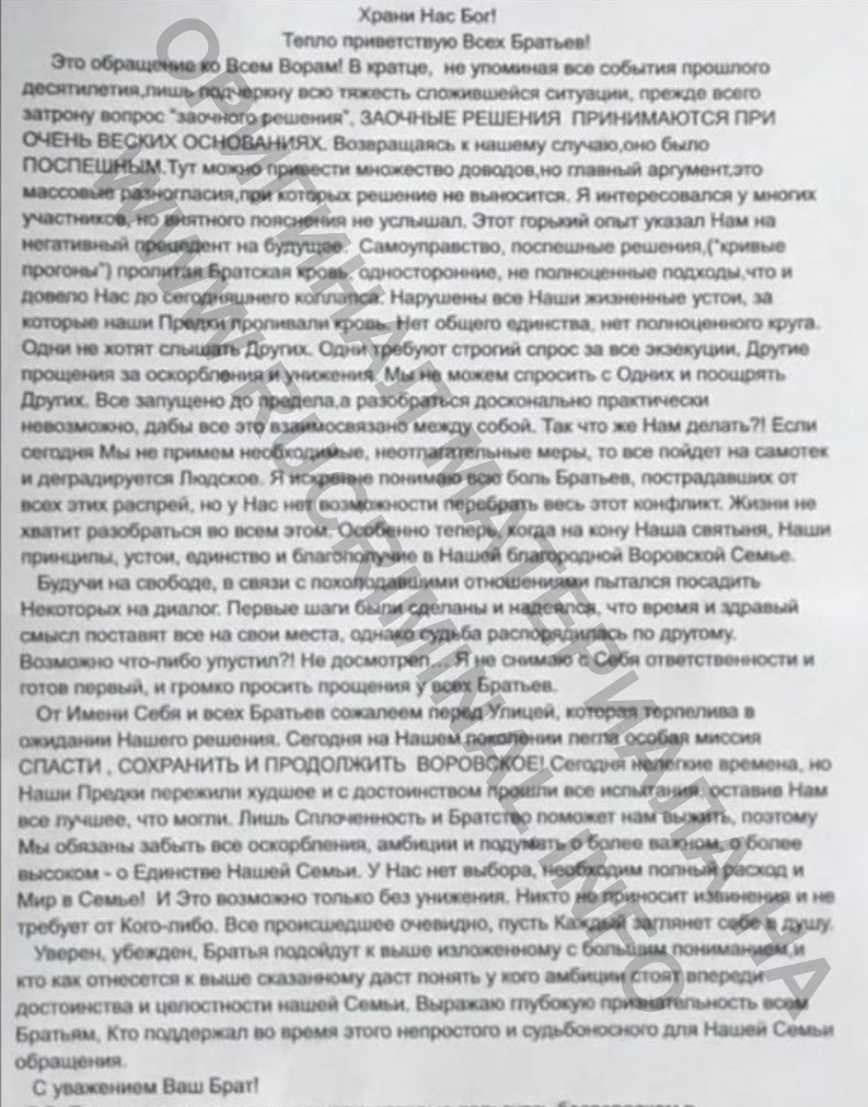 В результате Бадри убедил Шакро в правильно такого шага и на свет появилось послание Калашова о необходимости всем «ворам в законе» без извинений снять претензии друг к другу.