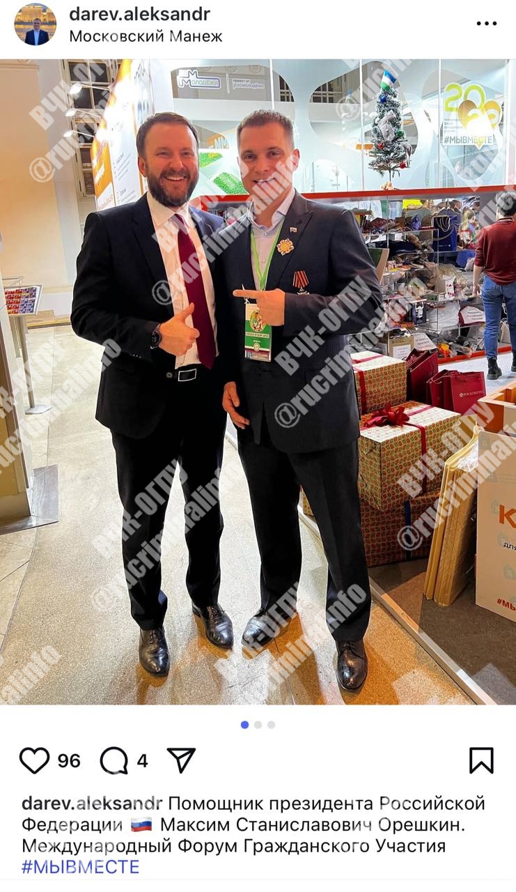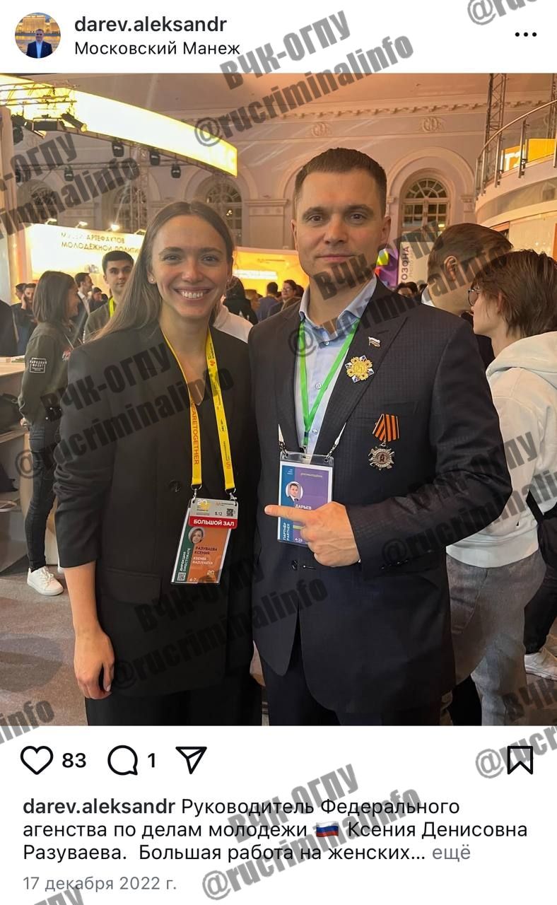 В своих постах Александр Дарьев неоднократно упоминал главу Росмолодежи, указывая, что она его познакомила с председателем Госдумы по молодежной политике. А также засветился на форуме Мы Вместе, где, как писал ВЧК-ОГПУ, почётным гостем также был гражданский супруг Ксении Разуваевой, министр Московской мэрии Алексей Немерюк.
