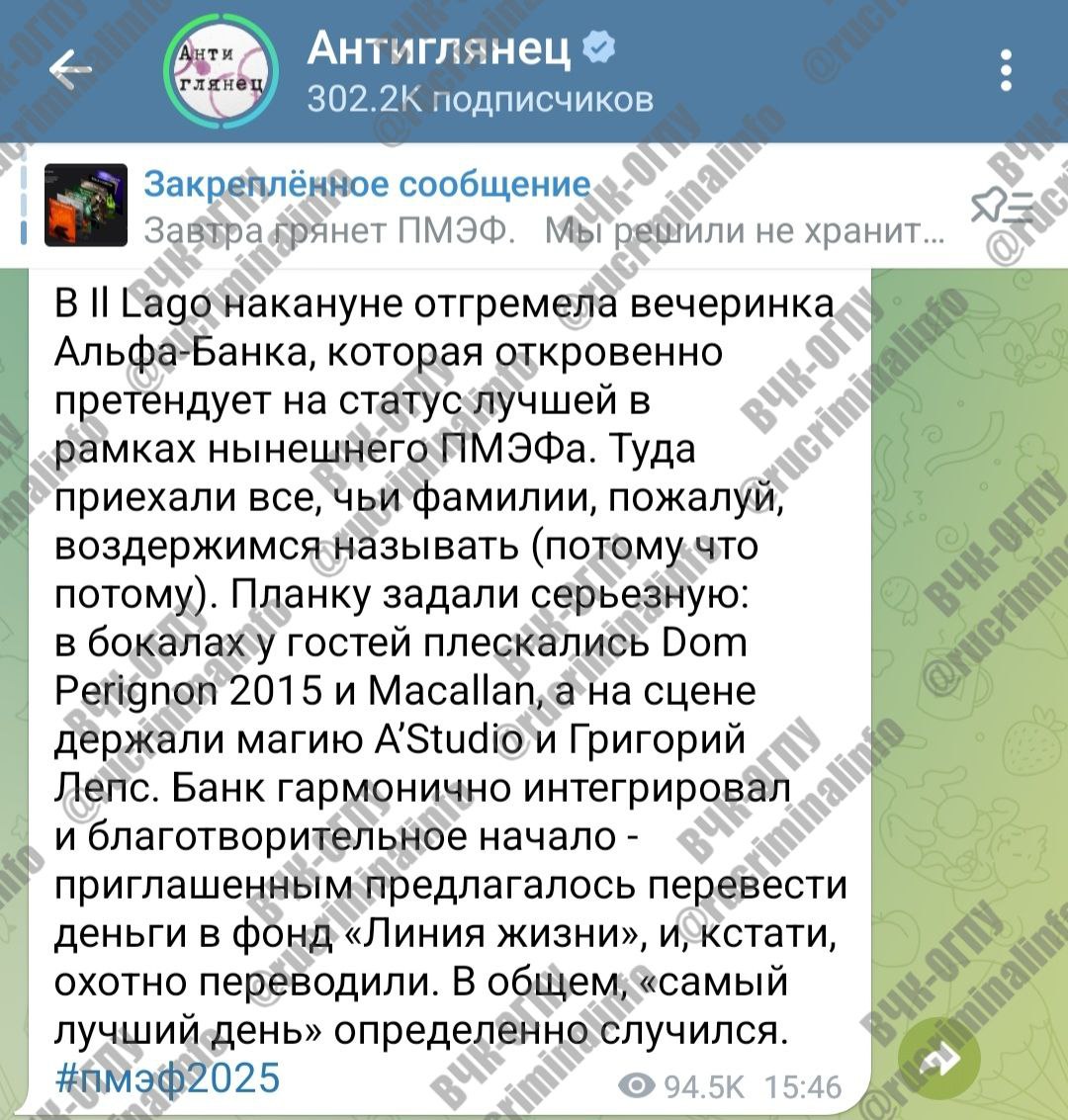 Возмущение вызвало то, что Альфа-банк устроил «шабаш» с ведрами чёрной икры, литрами шампанского Дом Периньон, лингустами и лапами только доставленных дальневосточных крабов в условиях навязываемого в стране культа «солдата в окопе». В соцсетях пошли отзывы, что, видимо, ради таких вечеринок и погибают люди на территории Украины…