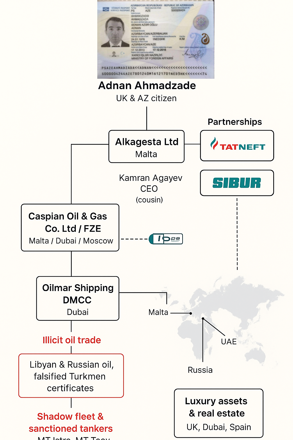 Несмотря на то, что у Аднана Ахмадзаде есть британский паспорт, теперь его обвиняют в использовании британского гражданства для юридического прикрытия активов Алекперова и содействия торговле нефтью российских нефтяных компаний, таких как «Лукойл», «Татнефть», «Сибур», «Сургутнефтегаз» и другие.