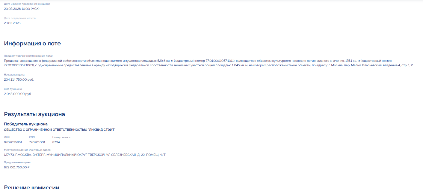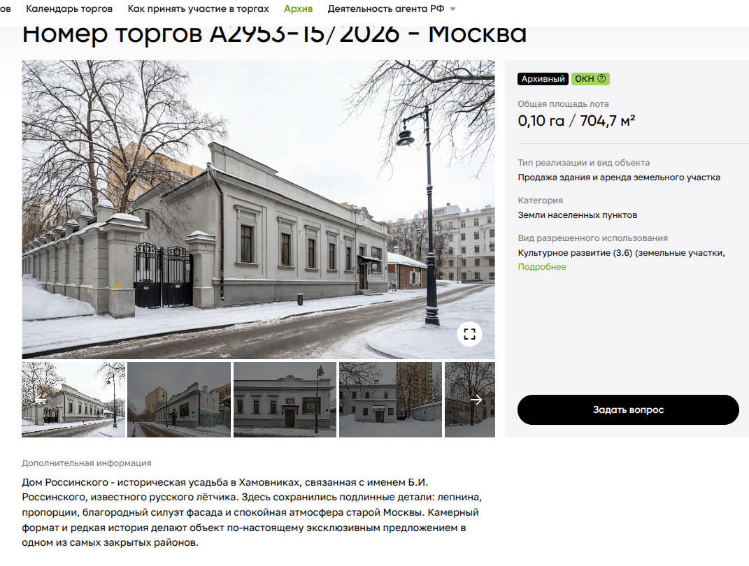 23 марта госкомпания Дом.РФ подвела итоги по продаже исторического наследия - особняка летчика Бориса Россинского - двух зданий общей площадью 704,7 кв.метров на арендованной земле - 0,1 га. Лот в ходе торгов подорожал с 204,2 до 672,1 млн рублей.
