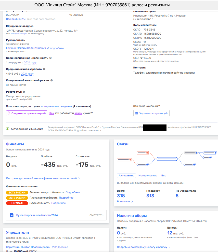 При этом само ООО «Ликвид Стэйт» не более чем техническая фирма для подобного рода сделок, судя по ее характеристикам. И необходимую сумму Харитонин взял точно не из её бюджета - на 2024 год фирма, учрежденная в сентябре 2024 года, была убыточна на 435 тыс. рублей и имела нулевую выручку. К тому же в компании - 1 сотрудник, минимальный уставный капитал и эти пару лет она словно бы лежала в загашнике на случай вот таких торгов.