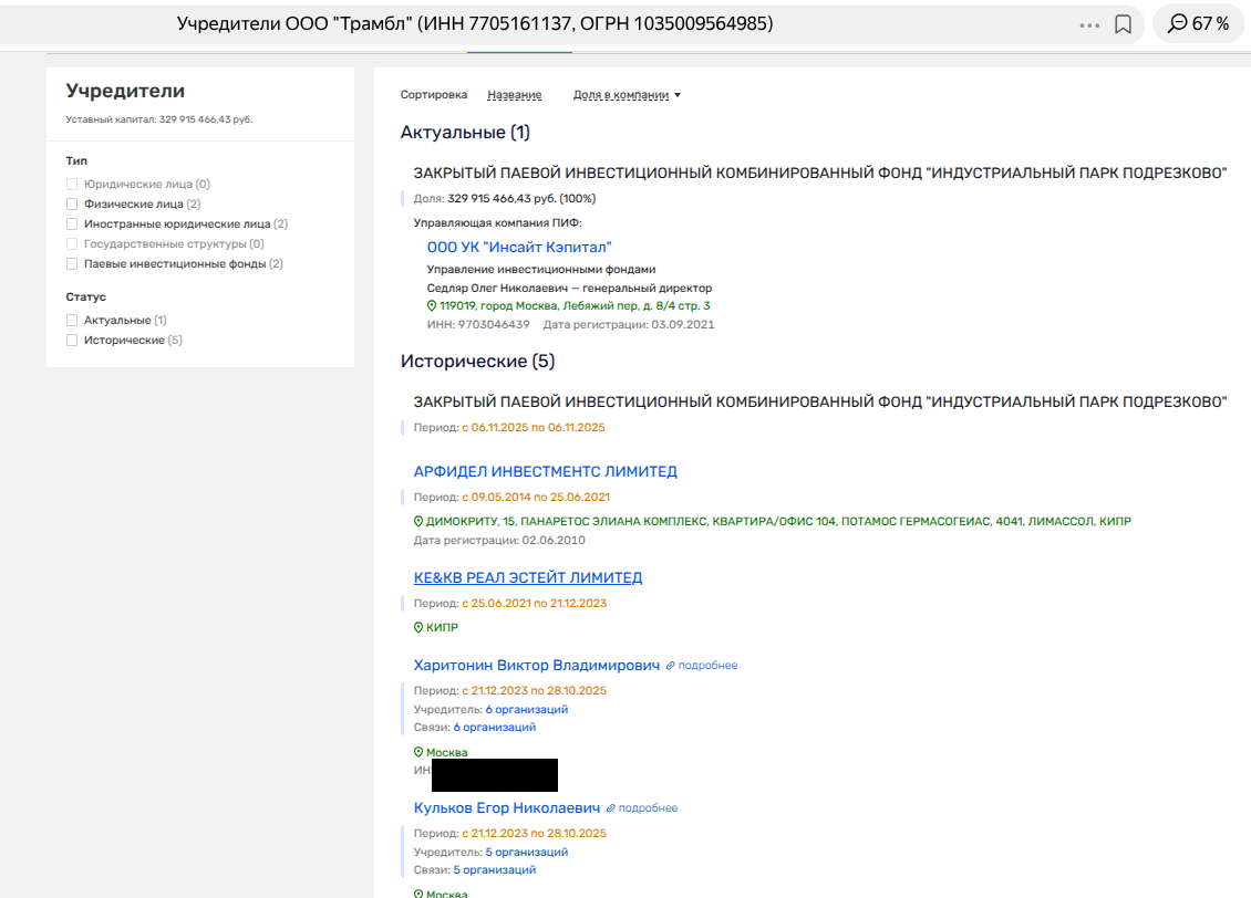 Харитонин же был в числе владельцев с декабря 2023 по конец октября 2025 года. До него и Кулькова доли имели кипрское АРФИДЕЛ ИНВЕСТМЕНТС ЛИМИТЕД и КЕ&КВ РЕАЛ ЭСТЕЙТ ЛИМИТЕД.