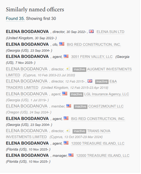 Но самое интересное не это, а то, что ее полная тезка является руководителем и секретарем 35 компаний, львиная доля которых прописана в Великобритании и США. При этом фирмы продолжают штамповать. Например, 3051 FERN VALLEY, LLC и 12000 TREASURE ISLAND, LLC учредили в ноябре 2025 года.