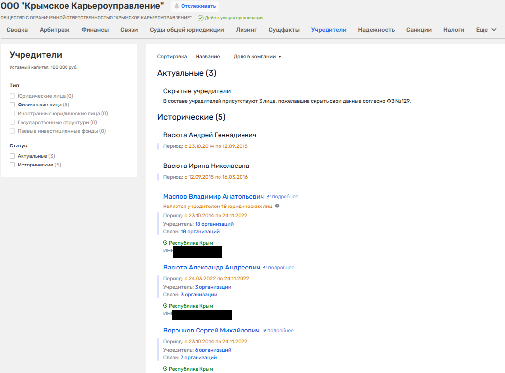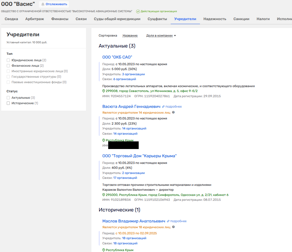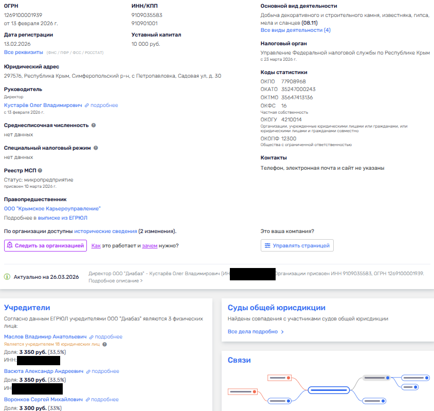 В середине февраля 2026 года в ЕГРЮЛ появилось некое ООО «Диабаз» с пропиской в Симферопольском районе Крыма. Занимается фирма добычей строительного камня и сопутствующих материалов. Владельцами там Владимир Маслов, Александр Андреевич Васюта и некий Сергей Воронков.