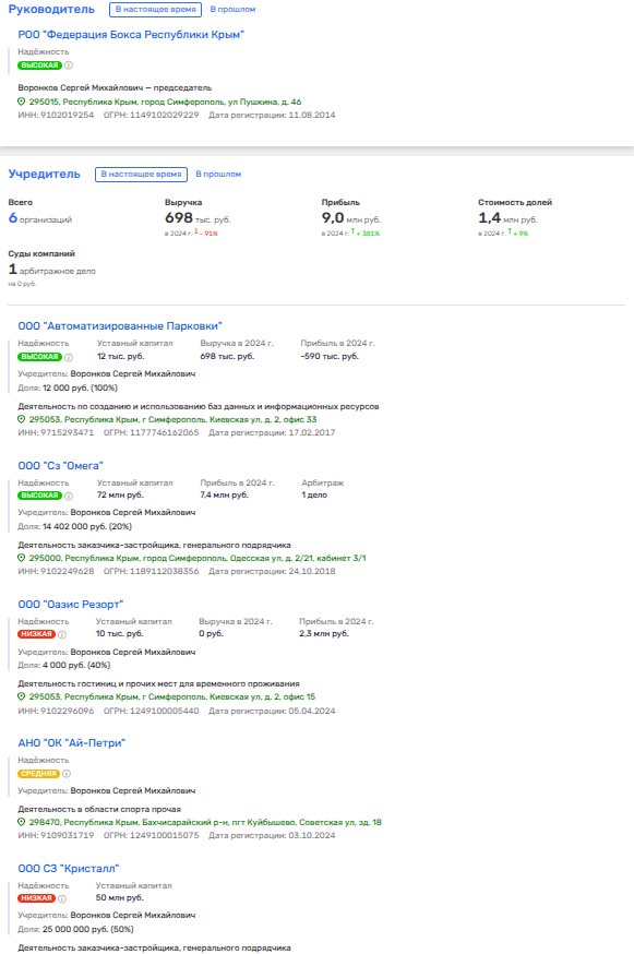 Вишенка на торте в том, что на сегодня Воронков также глава федерации бокса, а вот там в статусе почетного председателя - Бородкин Сергей Анатольевич, депутат Госсовета Крыма, который вместе с семейством тесно связан с бизнесом жены главы Крыма Еленой Аксеновой.