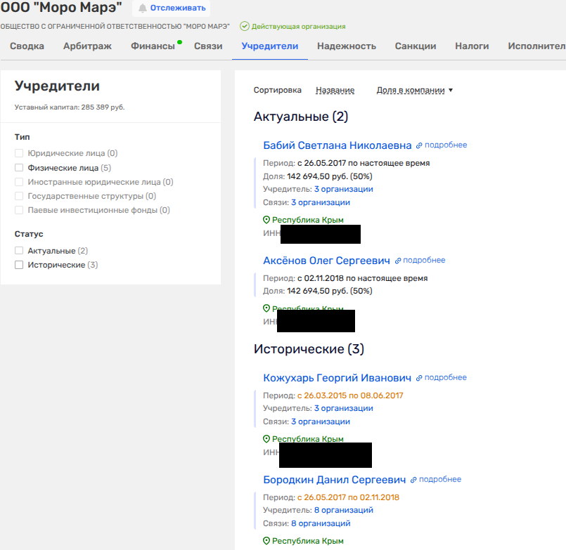 Видимо, не зря в своё время и фирме Воронкова с Масловым - ООО «Дом Чирахова» щедрой рукой Аксенова были переданы нежилые помещения в историческом объекте Симферополя. Там же, в объекте культурного наследия «Дом купца Х.К. Чирахова, конец XIX века» на проспекте Кирова, имело помещения и ООО «Моро Марэ», которое тогда принадлежало сыну Бородкина Даниилу и жене депутата - Светлане Бабий, а сейчас вместо Бородкина-младшего дольку имеет сын главы Крыма Олег Аксенов, чьим партнером остается мадам Бабий.