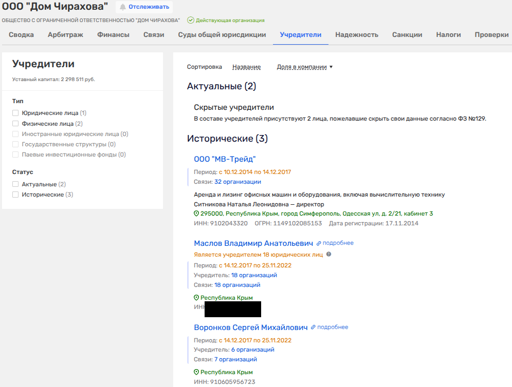 Кстати, в ООО «Дом Чирахова» в 2022 году Воронков, Маслов и ООО "МВ-Трейд" Маслова и Андрея Васюты стали скрывать свои уши. Видимо, чтобы не слишком демонстрировать щедрость первых лиц к себе?